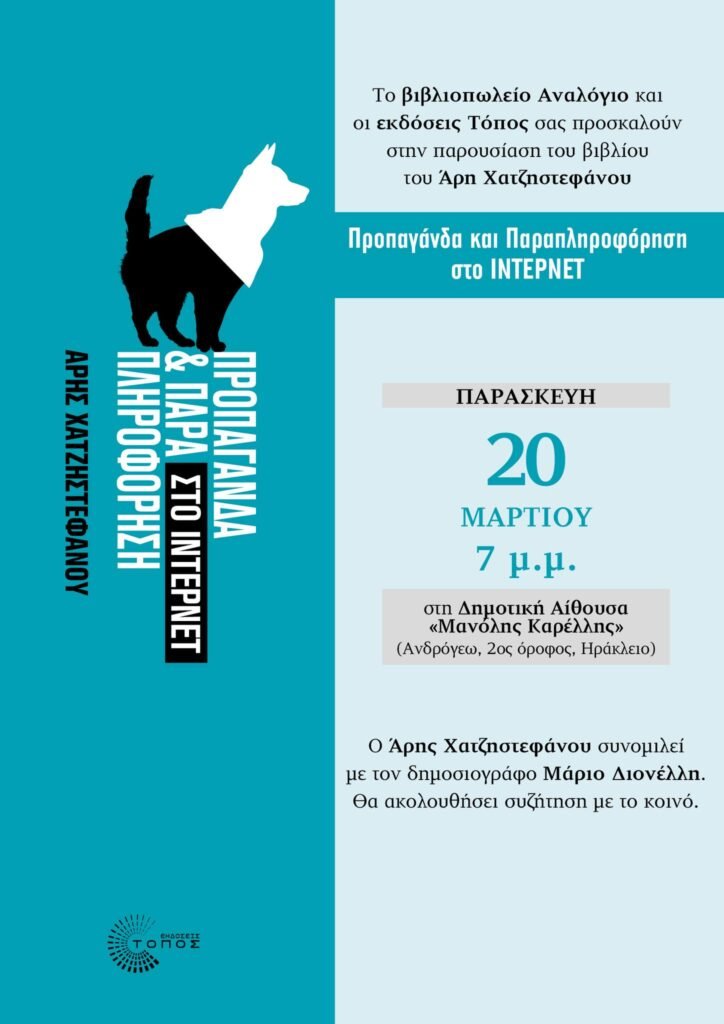 Το νέο βιβλίο του δημοσιογράφου Αρη Χατζηστεφάνου «Προπαγάνδα και Παραπληροφόρηση στο internet», παρουσιάζεται την Παρασκευή 20 Μαρτίου στο Ηράκλειο.