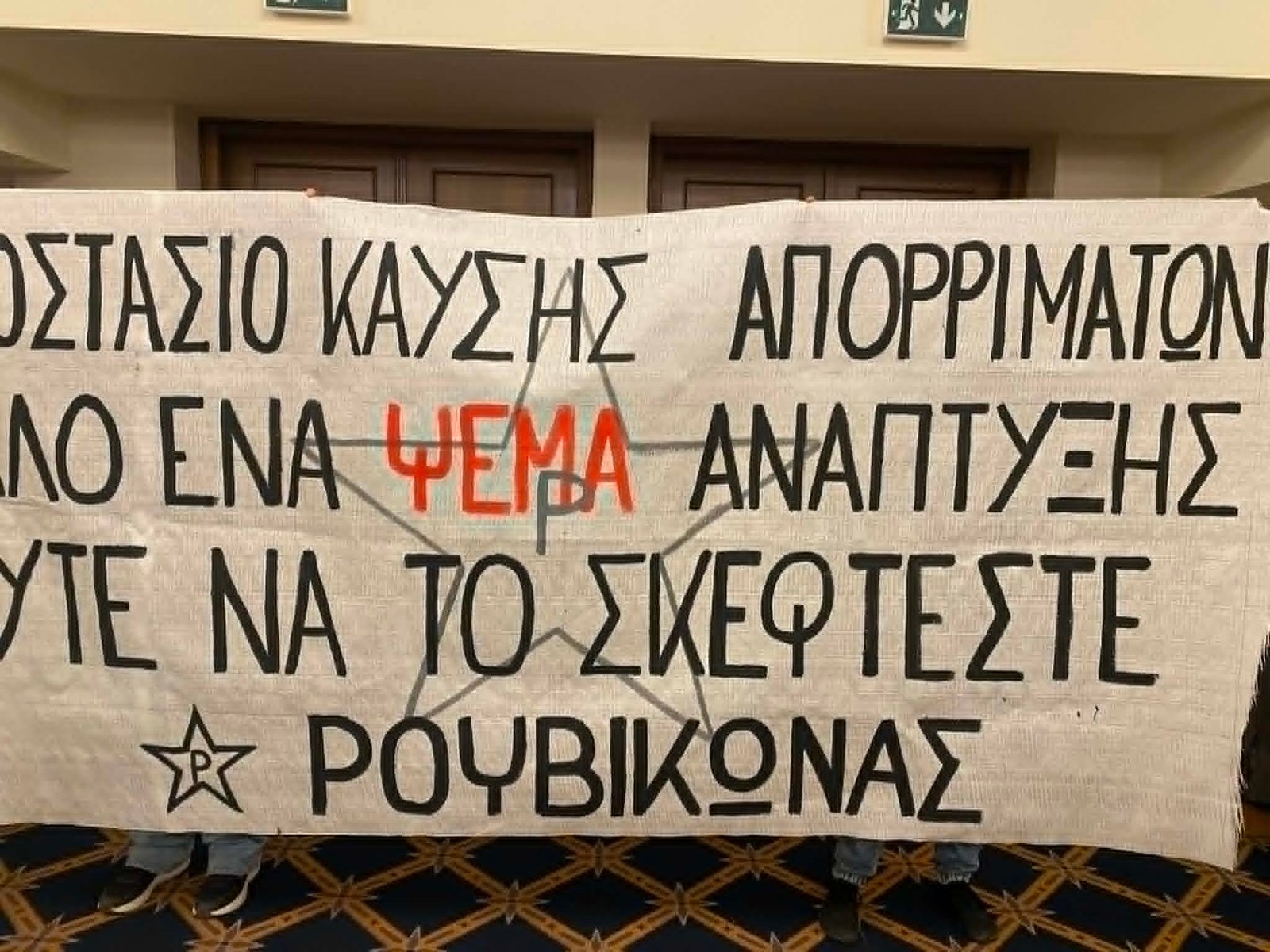 Στο μεταξύ, για την υπόθεση παρενέβησαν μέλη του Ρουβίκωνα, που σήκωσαν πανό το οποίο έγραφε: «Εργοστάσιο καύσης απορριμμάτων – Άλλο ένα ψέμα ανάπτυξης – Ούτε να το σκέφτεστε».