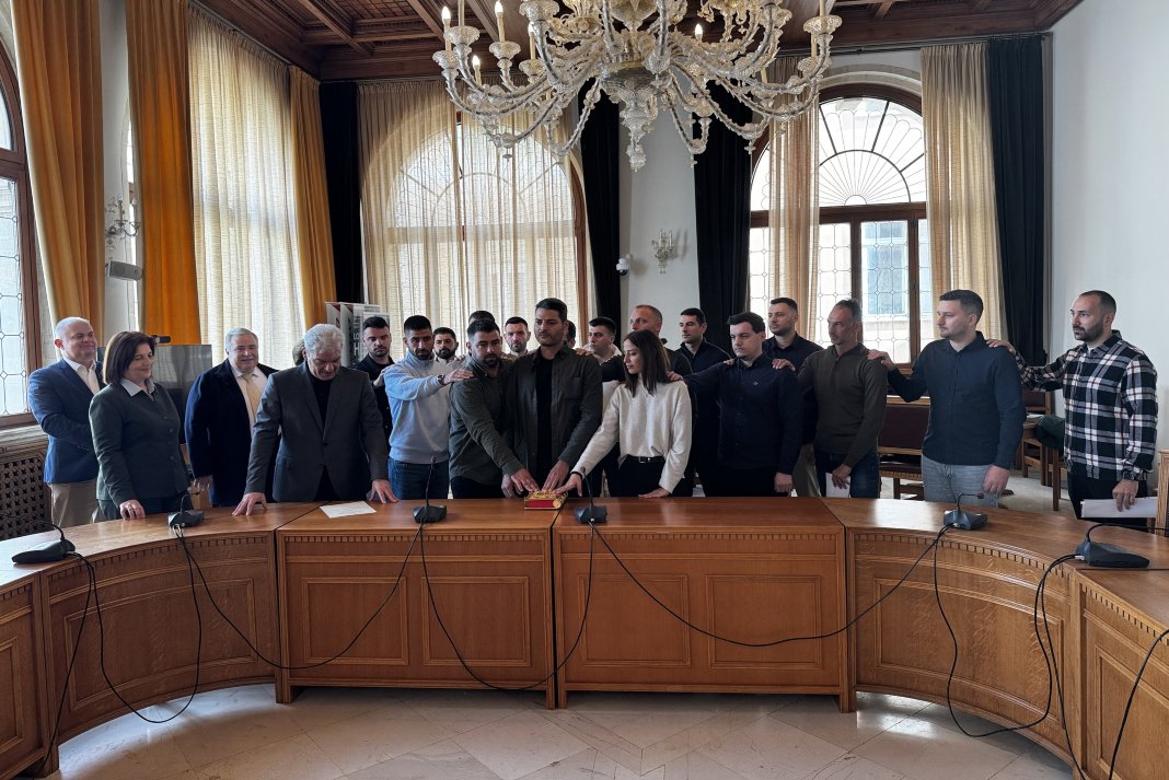 Πραγματοποιήθηκε από το Δήμαρχο Ηρακλείου Αλέξη Καλοκαιρινό η ορκωμοσία 17 νέων Δημοτικών Αστυνομικών, παρουσία των Αντιδημάρχων Πολιτικής Προστασίας & Δημοτικής Αστυνομίας Γιώργου Καραντινού, και Διοίκησης & Τουρισμού Γιώργου Αγριμανάκη, της Γενικής Γραμματέως του Δήμου Μαρίας Σκραφνάκη, της Προϊσταμένης του Τμήματος Δημοτικής Αστυνομίας Παρασκευής Πλατάκη καθώς και στελεχών της Δημοτικής Αστυνομίας, το πρωί της Δευτέρας 23/3 στη Λότζια.