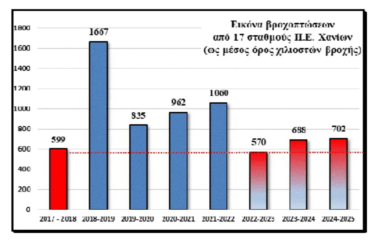 Η Αποκεντρωμένη Διοίκηση Κρήτης έδωσε τα στοιχεία βροχοπτώσεων του υδρολογικού έτους 2024-25.