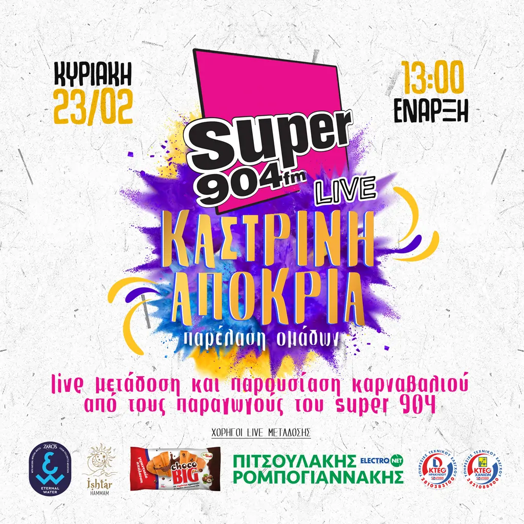 Το πιο super καρναβάλι του Νησιού έρχεται… Η αντίστροφη μέτρηση για το Kαστρινό Kαρναβάλι 2025 έχει ξεκινήσει και το… ραντεβού έχει δοθεί στη 1 το μεσημέρι. Όλοι θέλουν να συμμετάσχουν στο πιο ξέφρενο καρναβάλι… Με Super 90.4 ζωντανά από το κέντρο του Ηρακλείου.