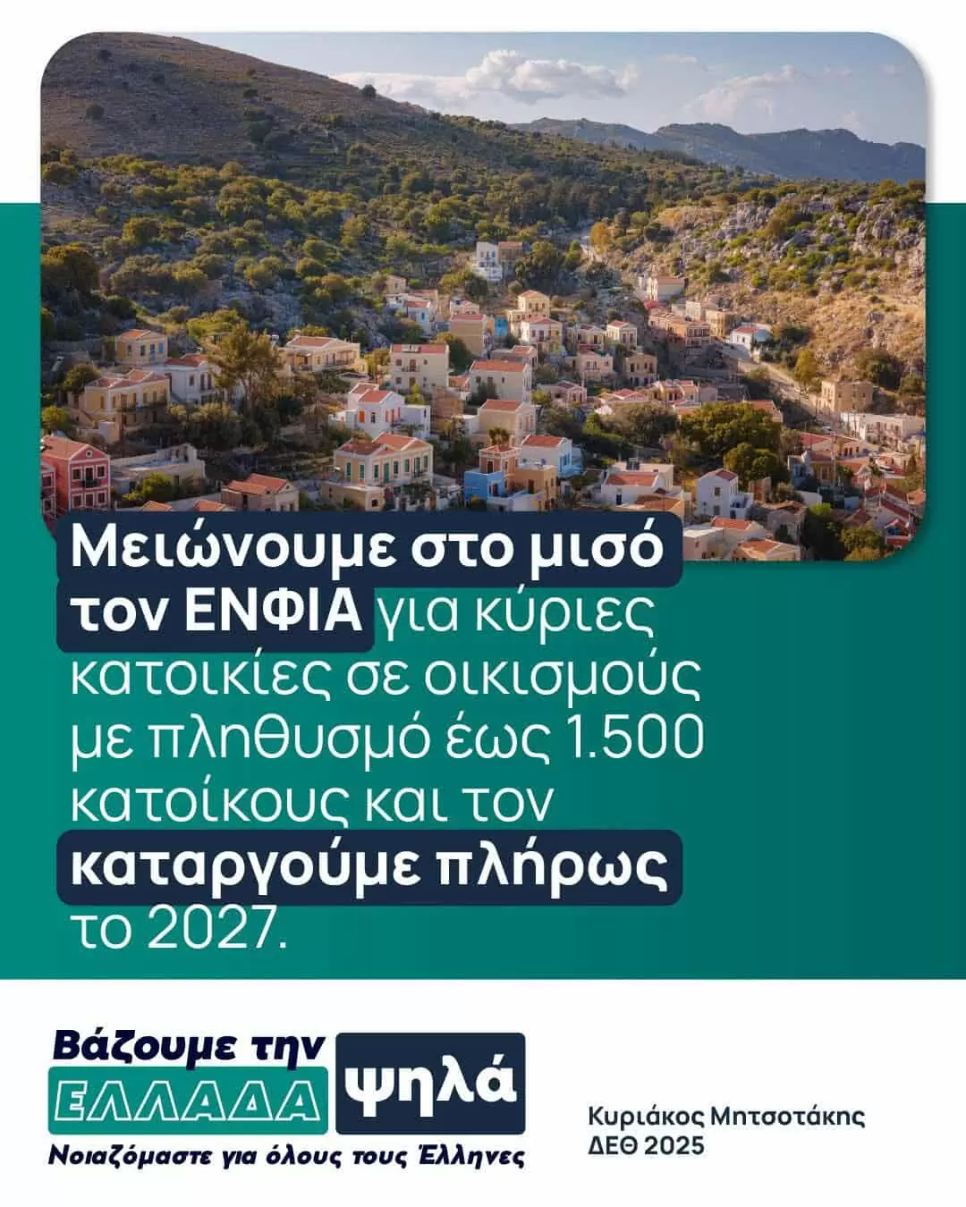 Συγκεκριμένα, ο Πρωθυπουργός ανακοίνωσε ότι από το 2026 ο ΕΝΦΙΑ μειώνεται στο μισό για τους κατοίκους χωριών με πληθυσμό κάτω των 1.500 κατοίκων, ενώ από το 2027 ο φόρος καταργείται πλήρως για τις περιοχές αυτές.