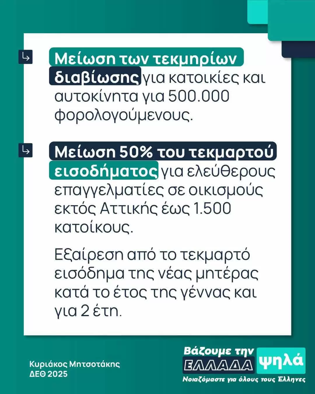 Τη μείωση των τεκμηρίων διαβίωσης που αφορούν κατοικίες και Ι.Χ. για περίπου 500.000 φορολογούμενους, καθώς και τη διεύρυνση των ευνοϊκών φορολογικών κριτηρίων για ελεύθερους επαγγελματίες που διαμένουν σε οικισμούς έως 1.500 κατοίκους, ανακοίνωσε σήμερα (06.09.2025) ο πρωθυπουργός Κυριάκος Μητσοτάκης, από το βήμα της 89ης Διεθνούς Έκθεσης Θεσσαλονίκης (ΔΕΘ).