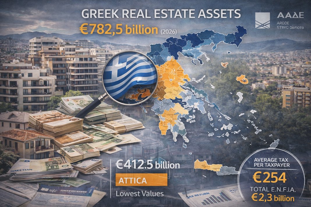 Στα 782,5 δισ. ευρώ ανέρχεται η συνολική αντικειμενική αξία της ακίνητης περιουσίας στην Ελλάδα για το 2026, σύμφωνα με στοιχεία της ΑΑΔΕ. Η Αττική συγκεντρώνει το μεγαλύτερο μέρος, ξεπερνώντας τα 412 δισ., ενώ η Δυτική Μακεδονία καταγράφει τις χαμηλότερες τιμές.
