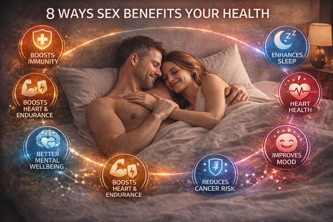 Το σεξ δεν είναι μόνο πηγή ευχαρίστησης, αλλά συνδέεται και με πολλαπλά οφέλη για την υγεία. Έρευνες δείχνουν ότι ενισχύει το ανοσοποιητικό σύστημα, βελτιώνει τον ύπνο και συμβάλλει στη σωστή λειτουργία της καρδιάς. Παράλληλα λειτουργεί ως ήπια μορφή άσκησης, βοηθώντας στην καύση θερμίδων.
