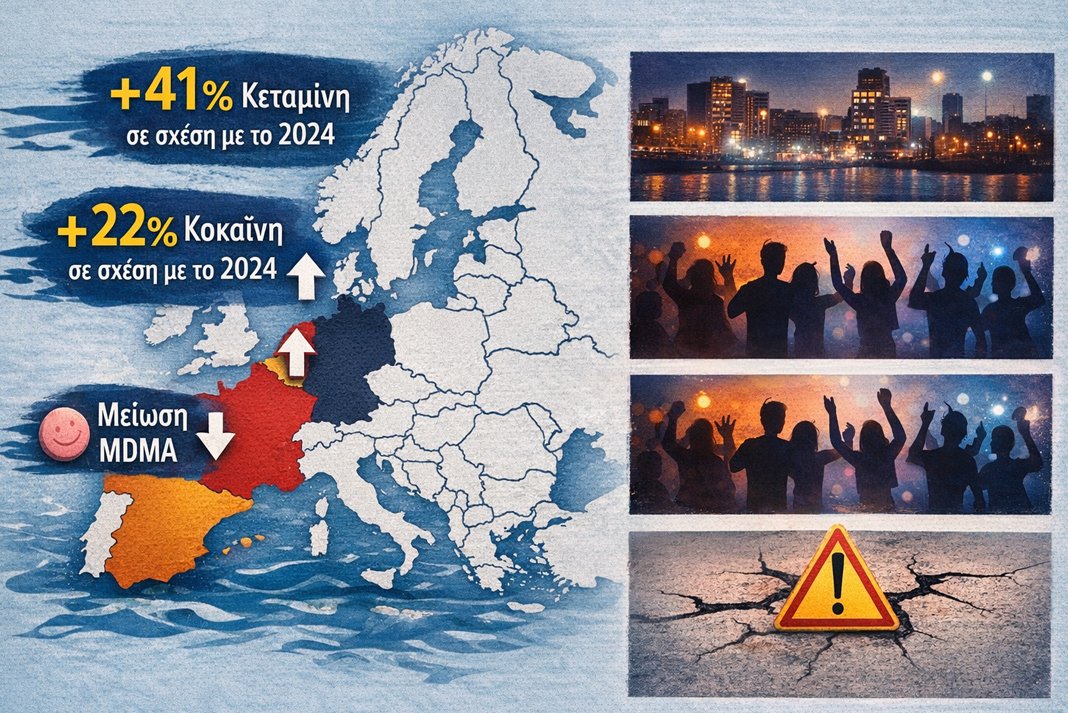 Η μελέτη κάλυψε 115 πόλεις σε 25 χώρες και δείχνει σημαντική άνοδο στην κοκαΐνη και κυρίως στην κεταμίνη, που αυξήθηκε σχεδόν κατά 41% σε σχέση με το 2024. Η κοκαΐνη ανέβηκε κατά 22%, με υψηλές συγκεντρώσεις σε Βέλγιο, Ισπανία και Ολλανδία. Αντίθετα, το MDMA παρουσίασε μείωση.