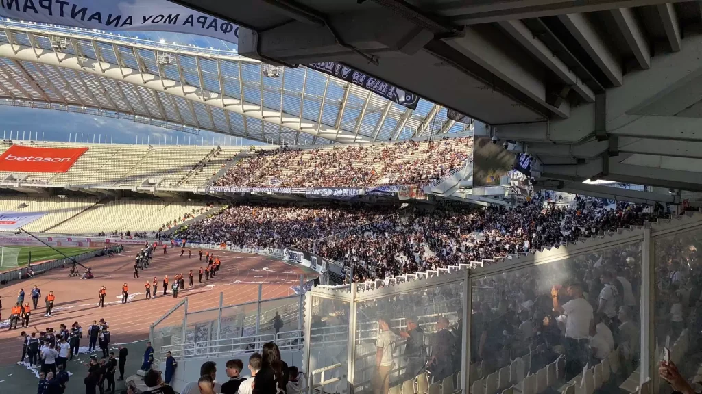 Ζεσταίνεται σιγά-σιγά η κερκίδα του ΟΦΗ…  Παίρνουν θέση στις εξέδρες του ΟΑΚΑ οι φίλοι του ΟΑΚΑ, ενώ αίσθηση προκαλεί το πανο που γράφει: Η μεγαλύτερη μετακίνηση τσικουδιάς στην Ελλάδα…