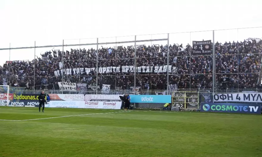 Στο «Θ. Κολοκοτρώνης» περίπου 1500 φίλοι του ηρακλειώτικου συλλόγου… έκλεψαν την παράσταση. Σήκωσαν, μάλιστα, ένα μεγάλο πανό στο πέταλο στο οποίο βρίσκονται και στο οποίο έγραφε: «Οι γιοι του Ψηλορείτη έρχονται ξανά».