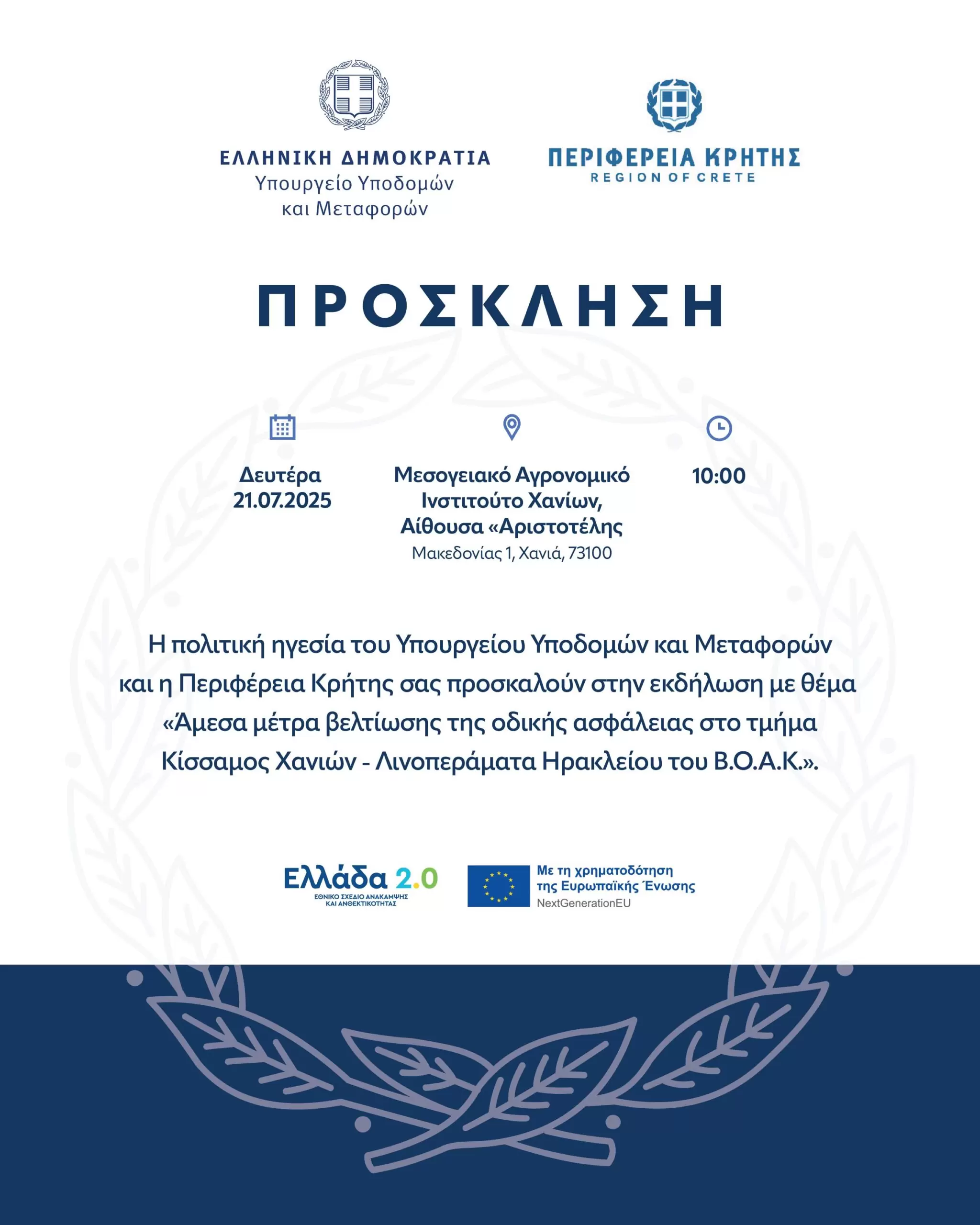 Κατά τη διάρκεια της εκδήλωσης αναμένεται να εξειδικευτούν οι παρεμβάσεις για την οδική ασφάλεια στην υπάρχουσα εθνική οδό, από την Κίσσαμο έως τα Λινοπεράματα,.