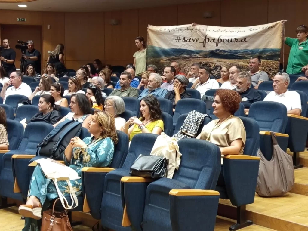Οι διαμαρτυρόμενοι λοιπόν, με επικεφαλής το δήμαρχο Μινώα Πεδιάδος Βασίλη Κεγκέρογλου, ύψωσαν πανό στο πίσω μέρος της αίθουσας, στο οποίο αναγραφόταν «Save Papoura» και με την συμπαράσταση σύσσωμης της Κρήτης εξέφρασαν για ακόμη μια φορά τόσο την αντίθεση όσο και την αγανάκτησή τους για την στάση του αρμόδιου Υπουργείου απέναντι στο συγκεκριμένο ζήτημα.