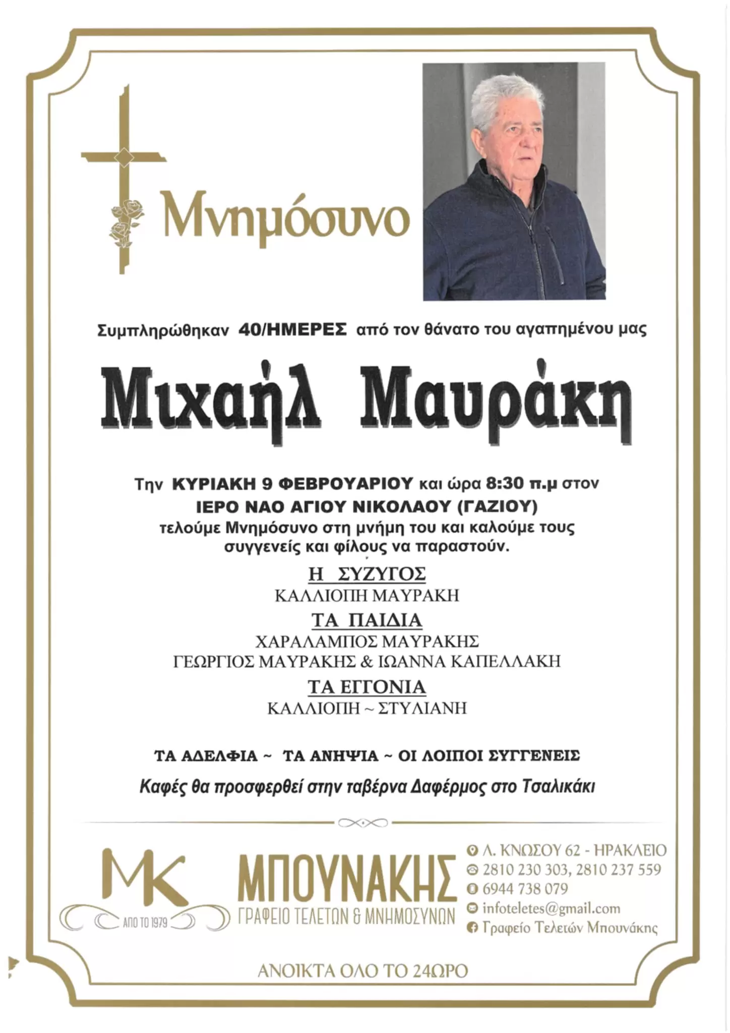 Το μνημόσυνο θα γίνει την Κυριακή (09/02) στις 8.30 το πρωί, στον Ιερό Ναό του Αγίου Νικολάου, στο Γάζι.