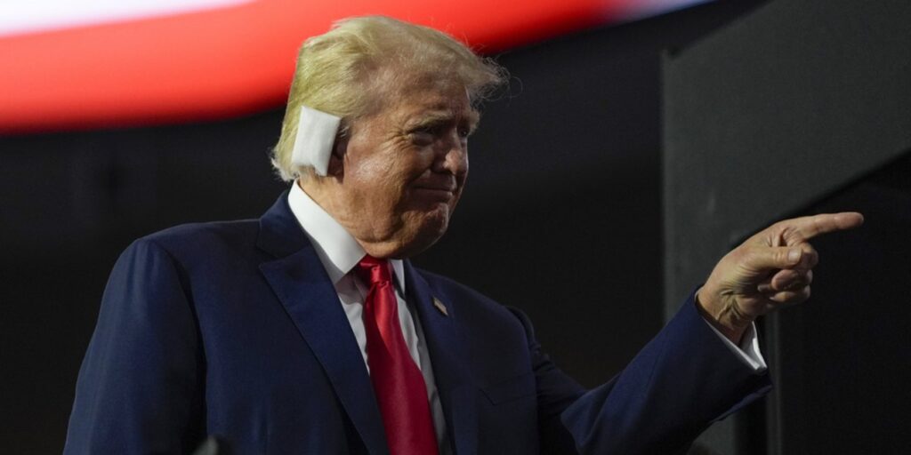 Ο πρώην πρόεδρος, που σώθηκε το Σάββατο για μερικά χιλιοστά από την απόπειρα δολοφονίας του, ύψωσε τη γροθιά του προσερχόμενος στην αίθουσα όπου διεξάγεται το συνέδριο του κόμματος, επευφημούμενος από τους συνέδρους που τον ονόμασαν και τυπικά νωρίτερα υποψήφιο της παράταξης στις προεδρικές εκλογές της 5ης Νοεμβρίου.